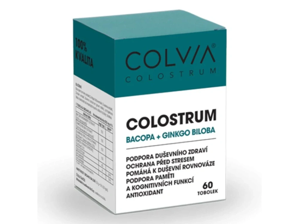 Doplněk stravy COLVIA Colostrum + Bacopa + Ginkgo Biloba obsahuje vhodně volenou kombinaci sušeného bovinního (kravského) colostra a extraktů Bacopy, Ginkgo biloba, guarany a ženšenu. Bacopa, ženšen a guarana podporují paměť. Ginkgo, bacopa a ženšen podporují kognitivní funkce. Bacopa podporuje koncentraci. Guarana a bacopa podporují odolnost vůči stresu. Vitamíny B5 a B6 a ženšen přispívají ke snížení únavy a vyčerpání.