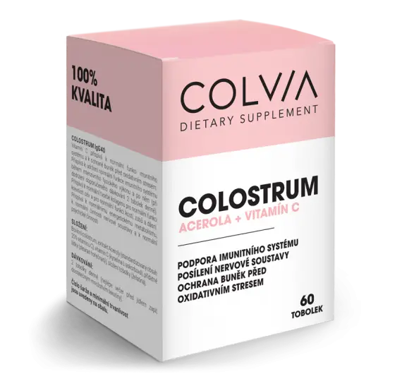 Doplněk stravy COLVIA Colostrum + Acerola + vitamín C obsahuje kombinaci bovinního (kravského) colostra, a vitamínu C, dodaného ve formě extraktu Aceroly a kyseliny L-askorbové. Colostrum je komplexem více než 200 aktivních složek, který je cenný vysokým obsahem biologicky aktivních látek